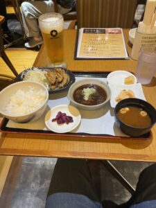 甘辛な手羽先とビール&ごはんとドテ煮、赤だしの味噌汁