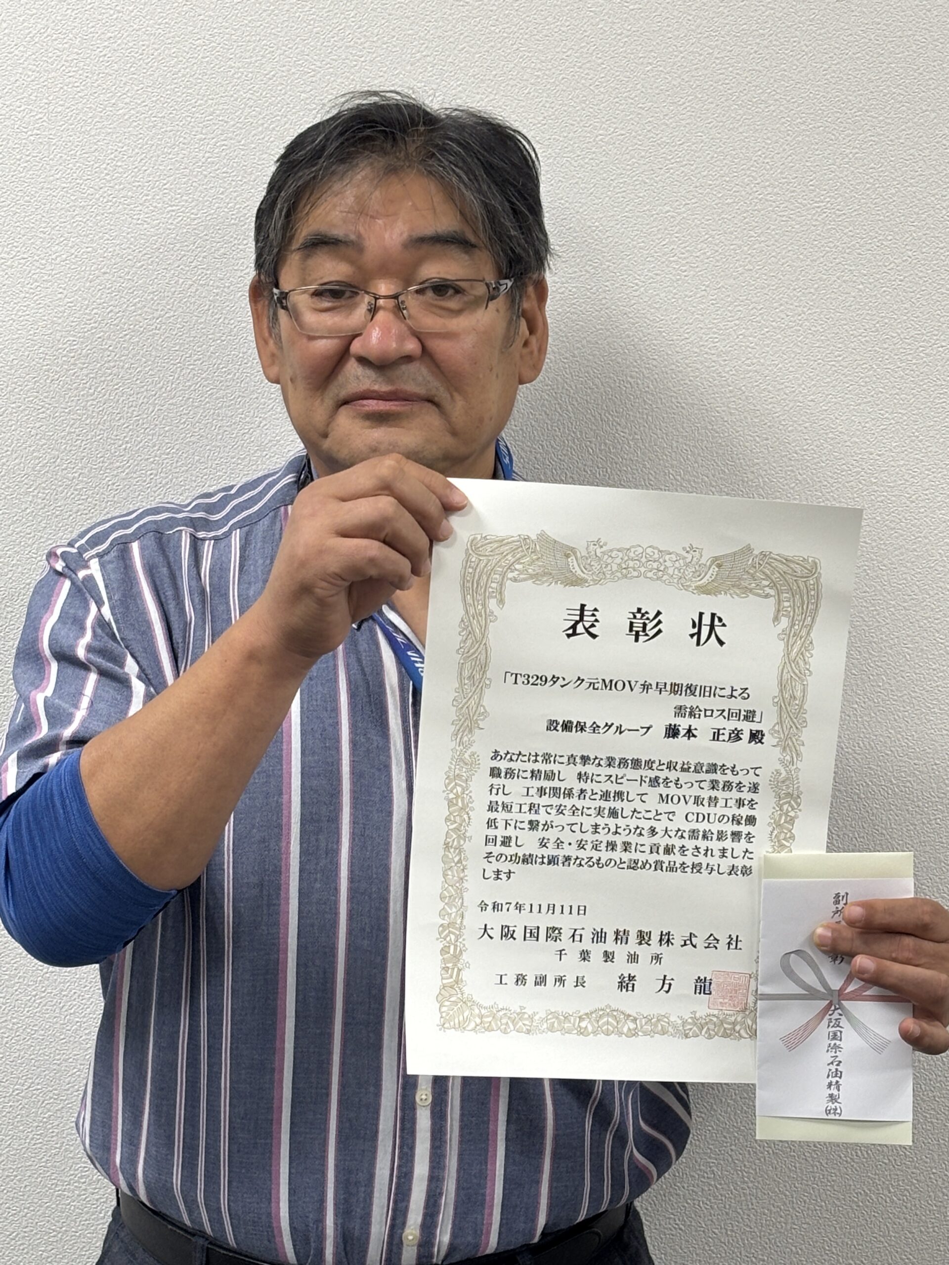 よって、その功績が認められ、派遣先である大阪国際石油精製株式会社より、本人に商品券と共に表彰状が授与されました。